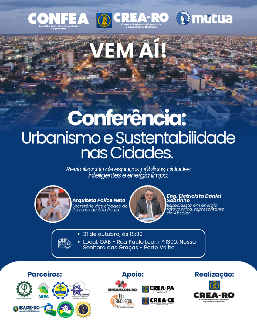 A Conferência Urbanismo e Sustentabilidade nas Cidades: Revitalização de espaços públicos, cidades inteligentes e energia limpa| 2025 ocorrerá no dia 31 de outubro de 2025, no Auditório da OAB Rondônia.