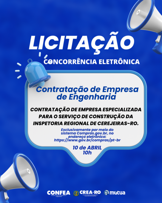 O Conselho Regional de Engenharia e Agronomia de Rondônia (Crea-RO) divulgou, no dia 16 de março de 2026, processo licitatório na modalidade Concorrência Eletrônica para a contratação de empresa de engenharia especializada na execução da obra para con ...