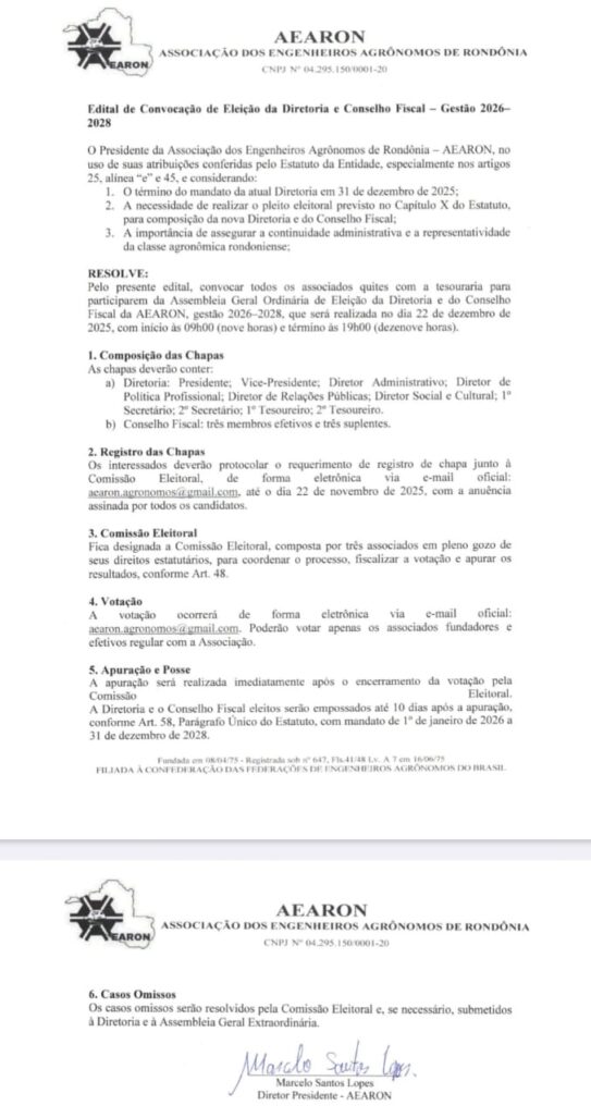 Comissão Eleitoral confirma regularidade dos integrantes e oficializa a candidatura à Diretoria e Conselho Fiscal da Associação Rondoniense de Engenheiros Ambientais.