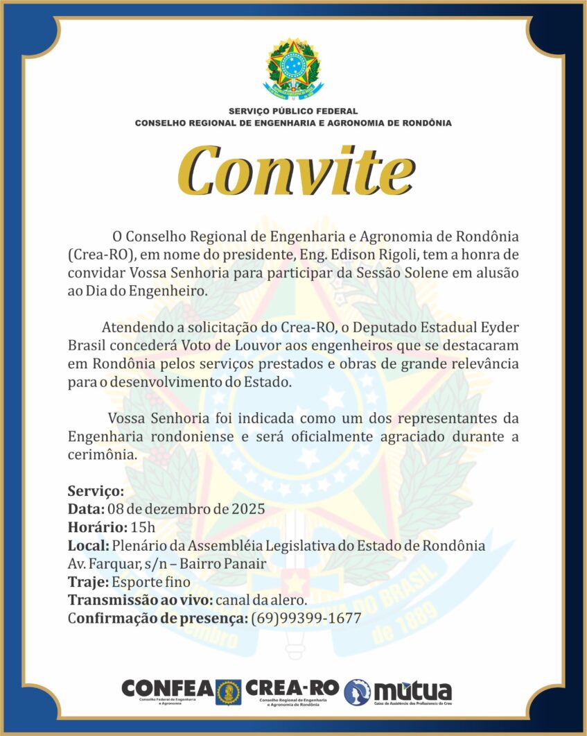 O Conselho Regional de Engenharia e Agronomia de Rondônia – Crea-RO, em nome do presidente, Eng. Edison Rigoli, tem a honra de convidar Vossa Senhoria para participar da Sessão Solene em alusão ao Dia do Engenheiro.