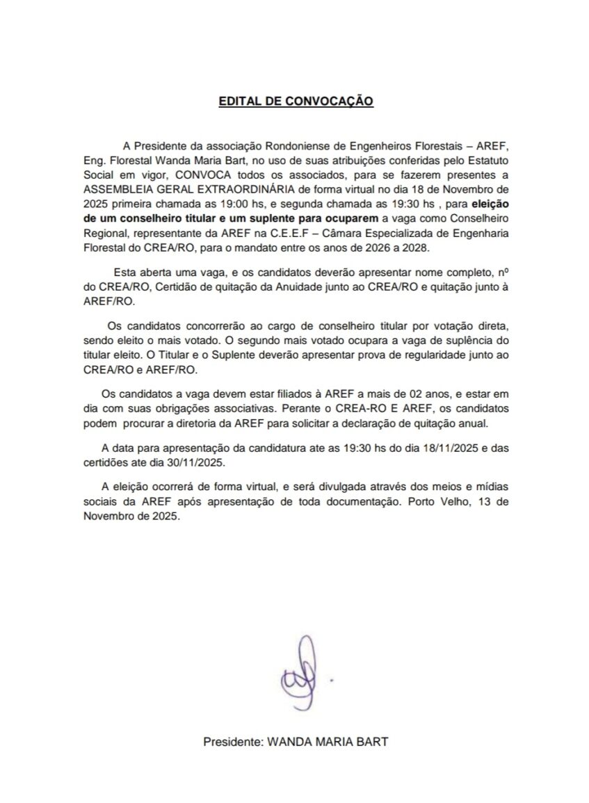 Aref convoca todos os associados, para se fazerem presentes a ASSEMBLEIA GERAL EXTRAORDINÁRIA de forma virtual no dia 18 de Novembro de 2025 primeira chamada as 19:00 hs, e segunda chamada as 19:30 hs , para eleição de um conselheiro titular e um suplente para ocuparem a vaga como Conselheiro Regional, representante da AREF na C.E.E.F - Câmara Especializada de Engenharia Florestal do CREA/RO, para o mandato entre os anos de 2026 a 2028