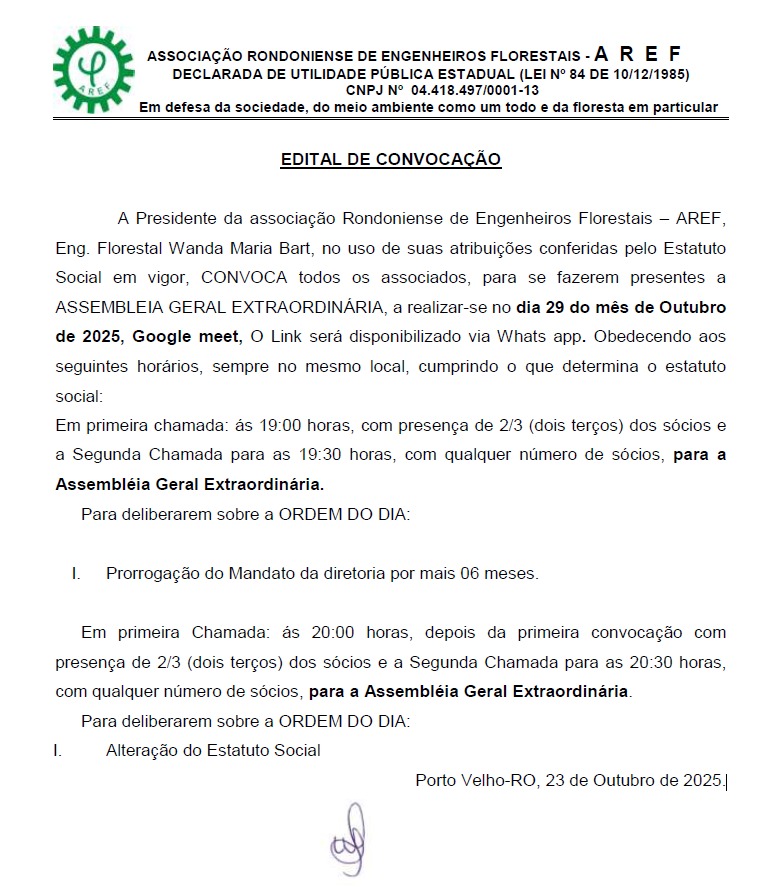 Aref convoca todos os associados, para a Assembleia Geral Extraordinária, a realizar-se no dia 29 de outubro de 2025, Google meet, link será diaponibilizado via Whatsapp.