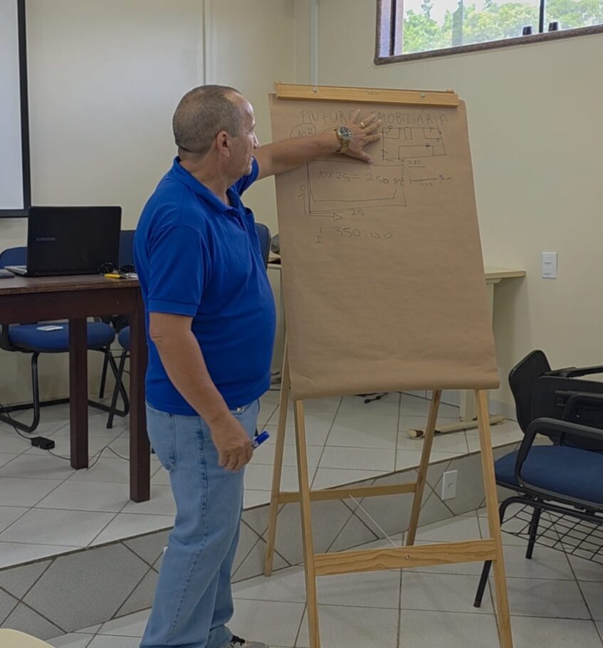 O instrutor Geraldo Magela explica que o curso aborda desde a parte teórica até a prática, incluindo elaboração de projetos de metragem quadrada e técnicas de pintura imobiliária.