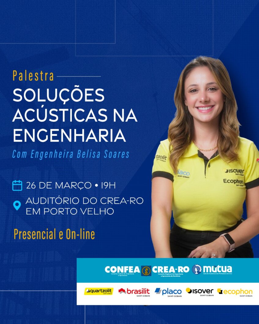 O Conselho Regional de Engenharia e Agronomia de Rondônia (Crea-RO), em parceria com a Isover, realizará no próximo dia 26 de março, às 19h, a palestra “Soluções Acústicas na Engenharia”, que será ministrada pela engenheira Belisa Soares. O evento acontecerá no auditório do Crea-RO, em Porto Velho, com participação presencial e também on-line.