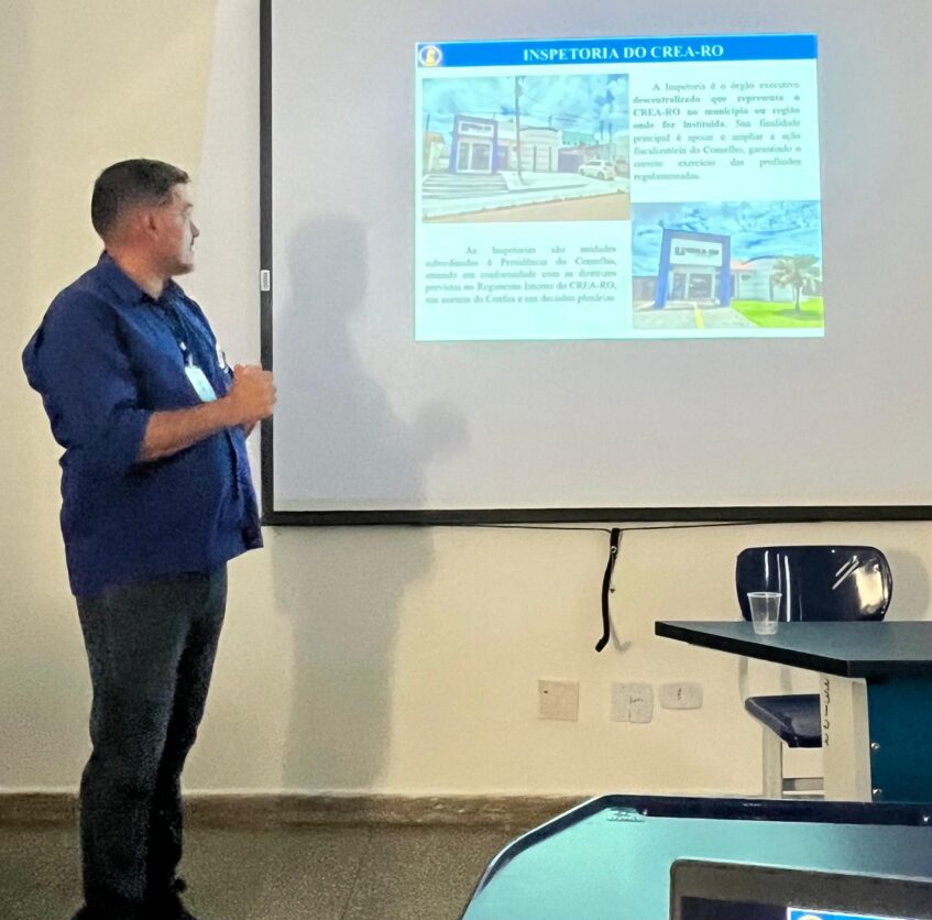 O Conselho Regional de Engenharia e Agronomia de Rondônia (Crea-RO) segue fortalecendo a aproximação com o meio acadêmico e contribuindo com a formação dos futuros profissionais do Sistema. O fiscal do Crea-RO, Eng. Leandro Topan, ministrou uma palestra institucional sobre o funcionamento e a importância do Sistema Confea/Crea para os acadêmicos do primeiro período do curso de Engenharia Civil da Universidade Federal de Rondônia (UNIR), campus de Ji-Paraná.