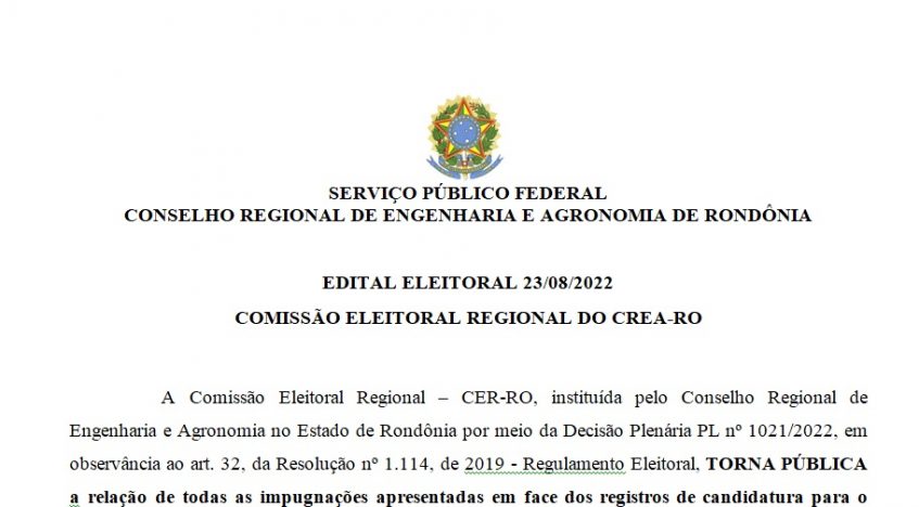 A Comissão Eleitoral Regional – CER-RO, instituída pelo Conselho Regional de Engenharia e Agronomia no Estado de Rondônia por meio da Decisão Plenária PL nº 1021/2022, em observância ao art. 32, da Resolução nº 1.114, de 2019 – Regulamento Eleitoral, TORNA PÚBLICO que não houve apresentação de impugnações aos registros de candidatura apresentados para o cargo de Diretor Administrativo da Caixa de Assistência dos Profissionais (“Mútua”), no estado de Rondônia.