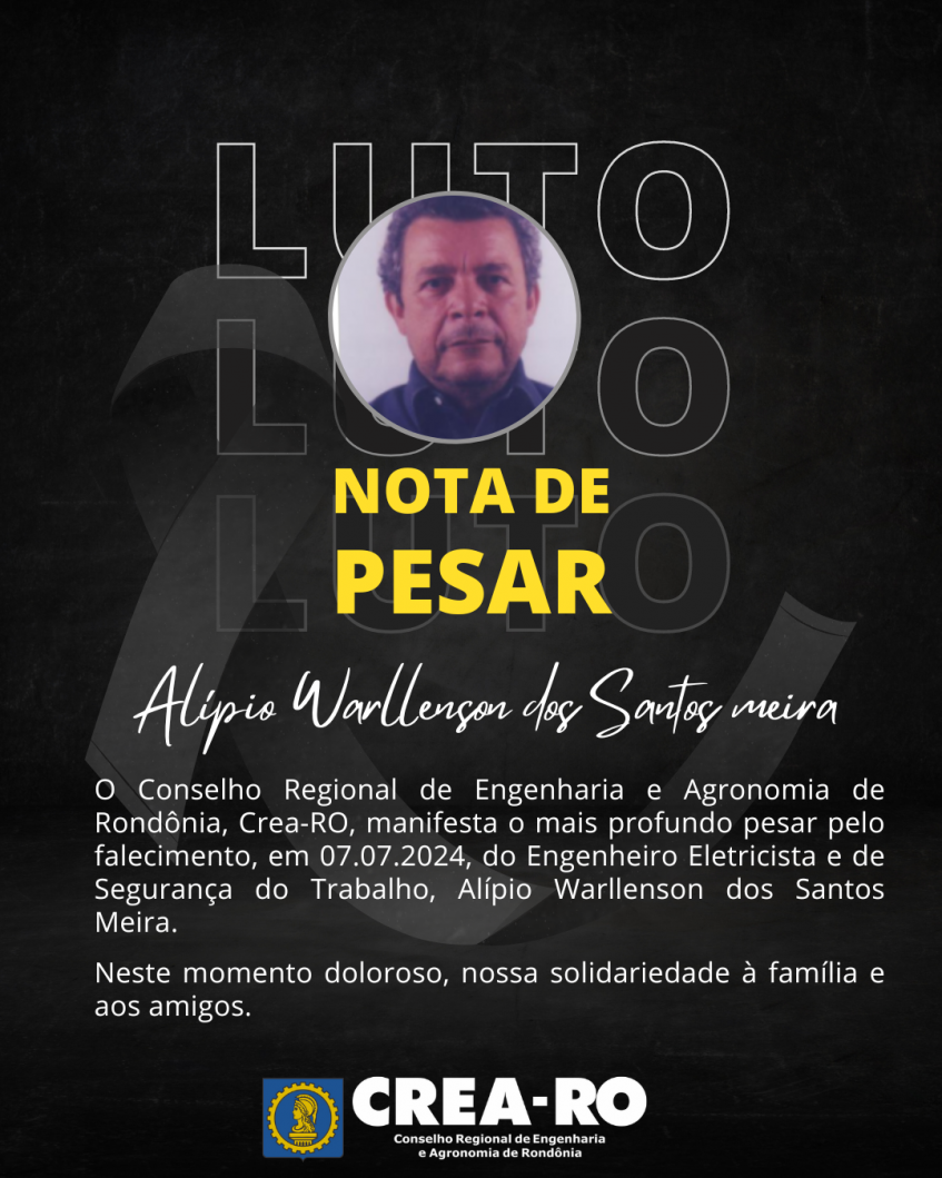 O Conselho Regional de Engenharia e Agronomia de Rondônia, Crea-RO, manifesta o mais profundo pesar pelo falecimento, em 07.07.2024, do Engenheiro Eletricista e de Segurança do Trabalho, Alípio Warllenson dos Santos Meira.