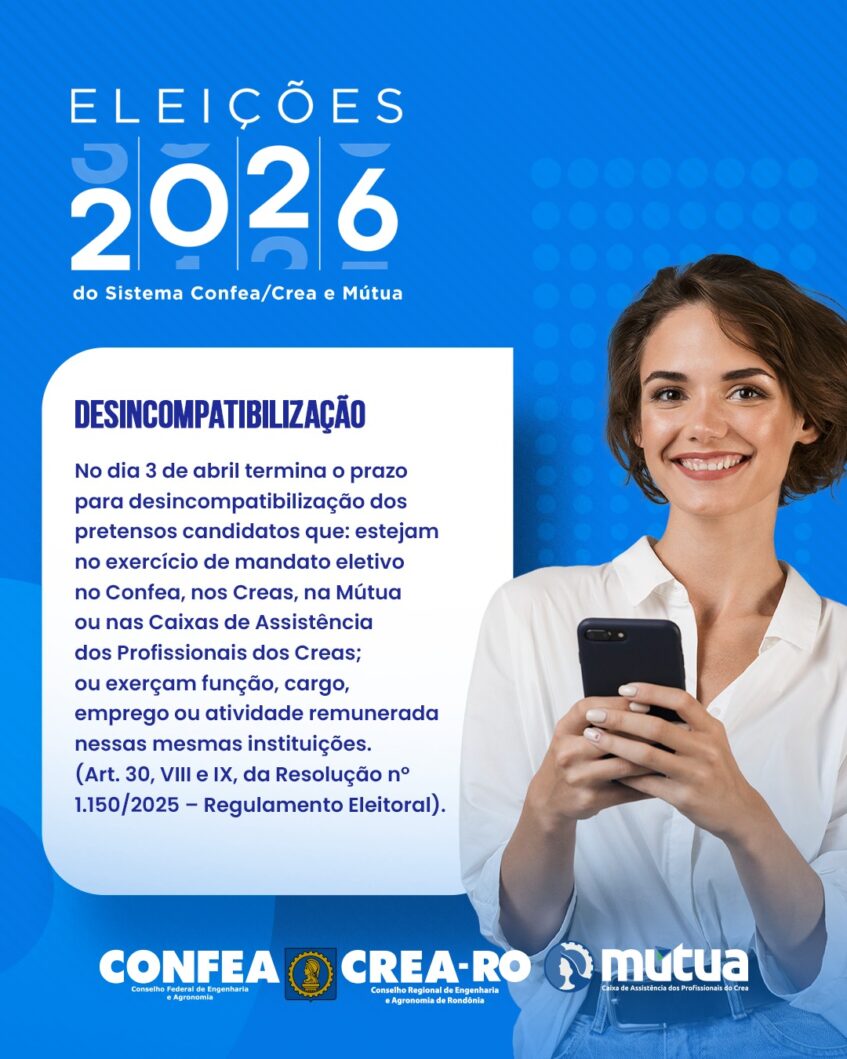 No dia 3 de abril termina o prazo para desincompatibilização dos pretensos candidatos que: estejam no exercício de mandato eletivo no Confea, nos Creas, na Mútua ou nas Caixas de Assistência dos Profissionais dos Creas; ou exerçam função, cargo, emprego ou atividade remunerada nessas mesmas instituições. (Art. 30, VIII e IX, da Resolução nº 1.150/2025 – Regulamento Eleitoral).