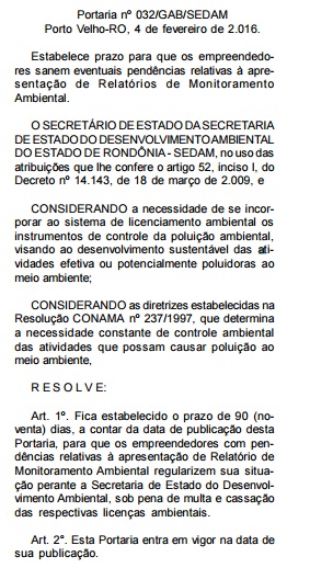 Em resposta a demanda dos profissionais do Sistema Confea/Crea, através de uma solicitação realizada pelo Conselho Regional de Engenharia e Agronomia de Rondônia (Crea-RO), juntamente com a seguintes associações; Aprogero, AEARON E AREF, o secretário da Secretaria de Estado do Desenvolvimento Ambiental (Sedam), estabeleceu um prazo 90 dias, através da Portaria nº 032/GAB/SEDAM de 12.02.2016, para que os empreendedores sanem eventuais pendências relativas à apresentação de Relatórios de Monitoramento Ambiental.
