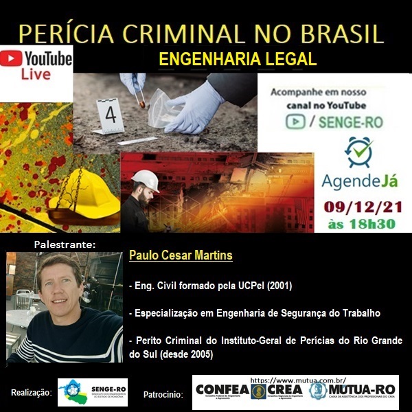 O Sindicato dos Engenheiros do Estado de Rondônia com apoio e patrocínio da Caixa de Assistência dos Profissionais do CREA/MÚTUA realizará Conferência sobre o tema: “Perícia Criminal no Brasil: Engenharia Legal” dia 09/12/2021 (quinta-feira), às ⏰ 18h30 (horário local), através do canal do Sindicato no youtube: SENGE-RO, link: https://www.youtube.com/watch?v=Qqj36MrH3O8